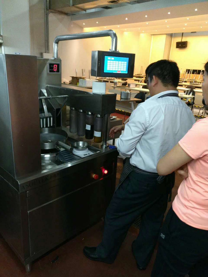 在餐饮集团研发总部,采用微电脑控制,通过物联网络,总厨只需要凭经验炒每道菜过程编成菜单程序输入到智能炒菜机,然后连接到每一家分店的智能炒菜机所有门店只需要厨工帮手就可以炒出总厨的拿手好菜,通过物联网络还可以实现每一道新菜品同时在每一个分店同时上线,操作简单,一键式完成炒菜全过程,模拟人手抛锅,无需人工参与,在有钱都请不到厨师大环境下,为餐饮连锁厨房出餐带来了极大的帮助